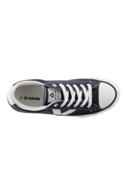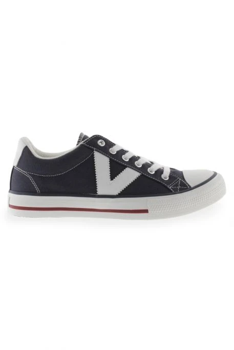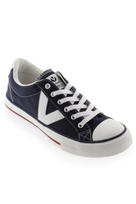 Chaussures Victoria Tribu pour homme. Chaussures basses en toile, fermeture par lacets, bout rond. Détail latéral du V de Victoria en contraste.