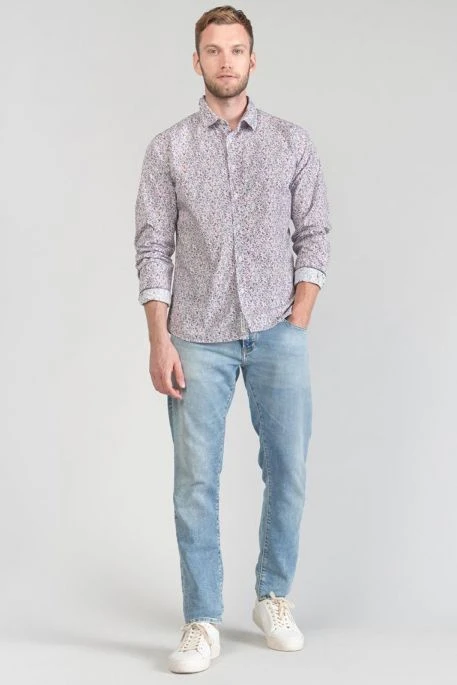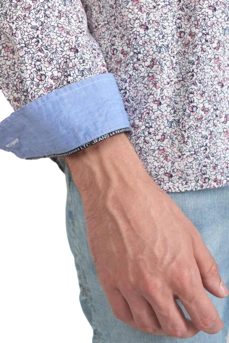 Chemise Le Temps des Cerises Flam pour homme. Chemise à manches longues, coupe droite, col classique et fermeture par patte de boutonnage. Modèle de chemise pour homme avec motif floral. Détails : boutons nacrés blancs et revers aux poignets avec liseré personnalisé « Le Temps des Cerises » et empiècement contrastant bleu ciel.