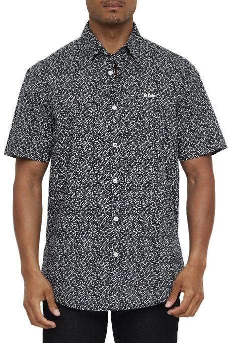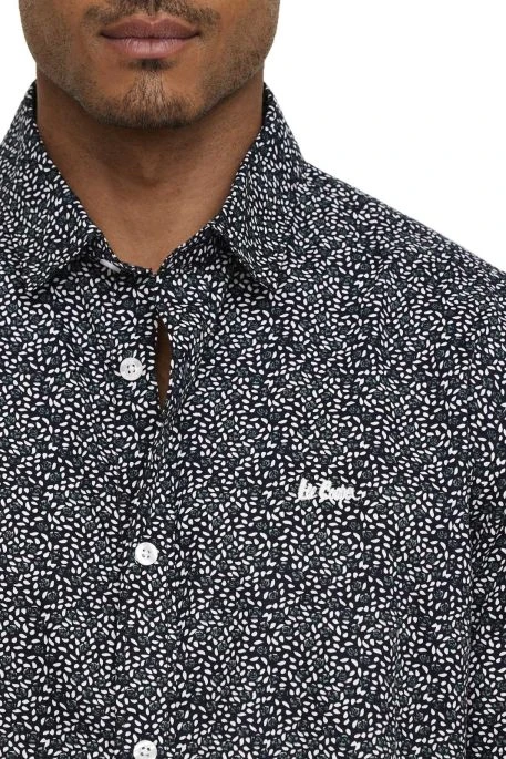 Chemise Lee Cooper Ditu Navy pour homme, chemise manches courtes avec motif fleurs broderie Lee Cooper blanche. La base de cette chemisette est arrondie pour vous permettre de la porter sortie sur un jeans.