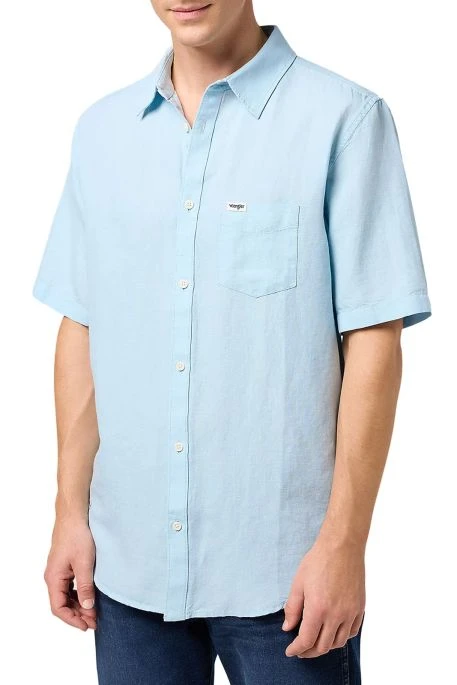 Chemise Wrangler Lin ciel, chemise pour homme manches courtes, poche poitrine avec étiquette de la marque dessus, confectionnée en mélange lin et coton, coupe regular décontractée.