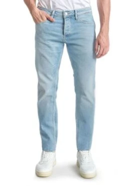 Jean Le Temps des Cerises pour homme. Jeans stretch, coupe slim 700/11 avec une hauteur de taille standard. Fermeture à boutons, poche arrière retournée et jacron en cuir.