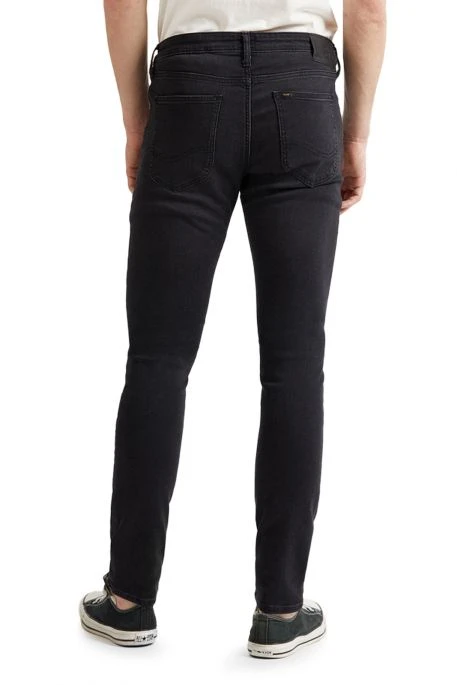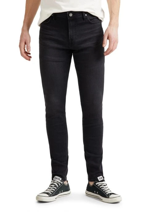 Jean Lee Malone pour homme. Jean de coupe skinny, taille basse, fermeture par bouton et braguette zippée. Toile en denim noir légèrement usé.
