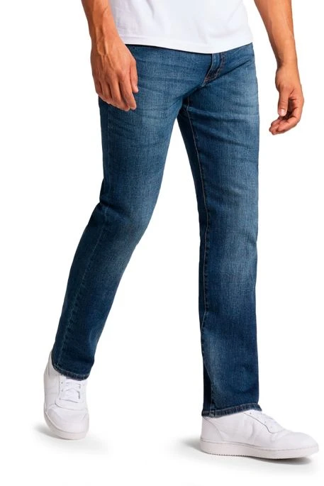 Jean Lee MVP Straight pour homme. Jean coupe droite aux cuisses et aux genoux, taille classique, bas des jambes droit classique. Ceinture élastiquée, fermeture par bouton et braguette zippée.