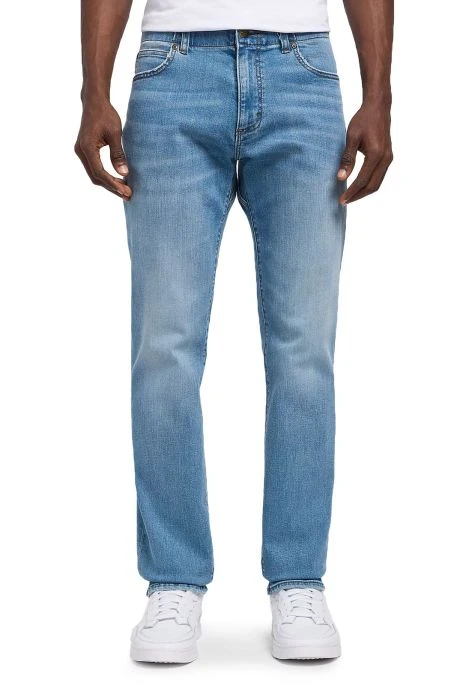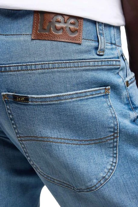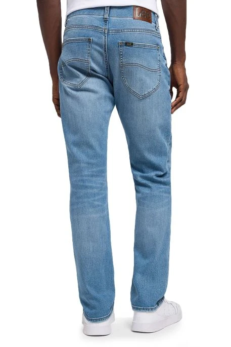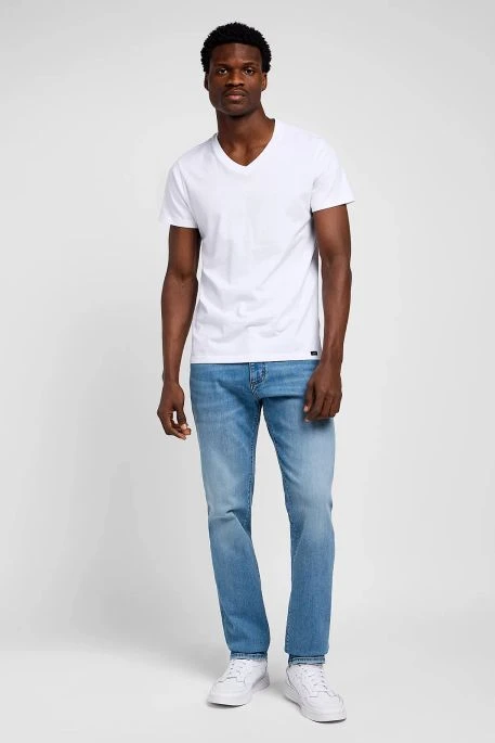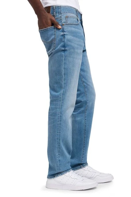 Jean Lee MVP Straight pour homme. Jean de coupe droite aux cuisses et aux genoux, taille classique, bas des jambes droit classique. Ceinture élastiquée, fermeture par bouton et braguette zippée.