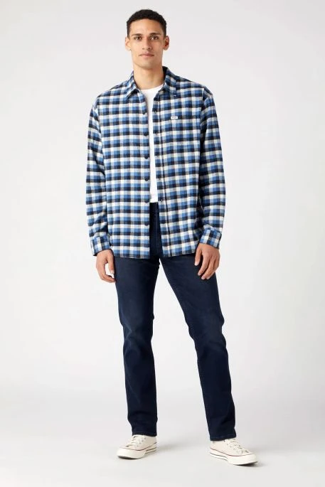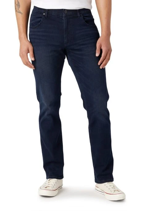 Jean Wrangler Greensboro pour homme. Jean de coupe droite, taille classique, braguette zippée, 5 poches. Ce modèle est idéal pour les personnes recherchant un jean confortable. Patch Wrangler brodé et couture « W » sur les poches arrières