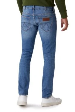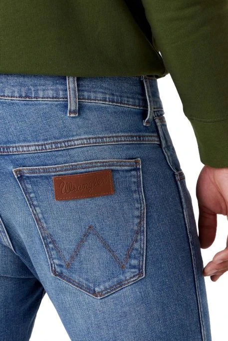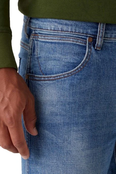 Jean Wrangler Larston pour homme. Jean de coupe slim, bassin ajusté, resserré jusqu’à la cheville (mais pas skinny). Braguette zippée, 5 poches. Patch en cuir authentique arborant le logo de la marque.