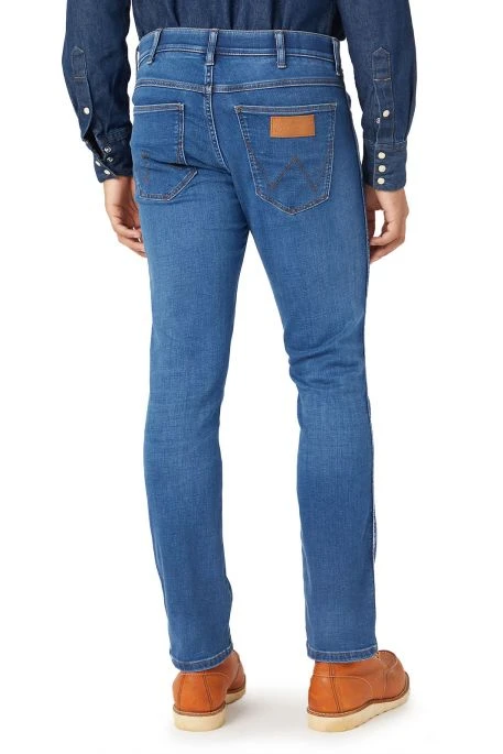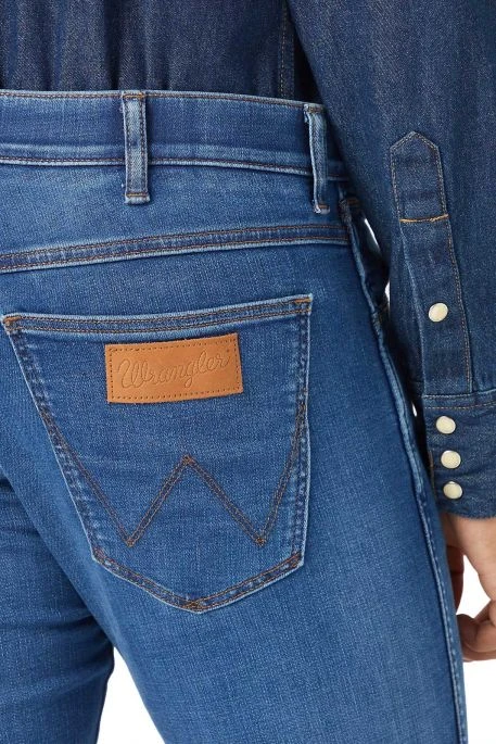 Jean Larston pour homme, Jeans Wrangler Larston pour homme. Jeans de coupe slim, bassin ajusté, resserré jusqu’à la cheville (mais pas skinny). Braguette zippée, 5 poches. Patch en cuir authentique arborant le logo de la marque.