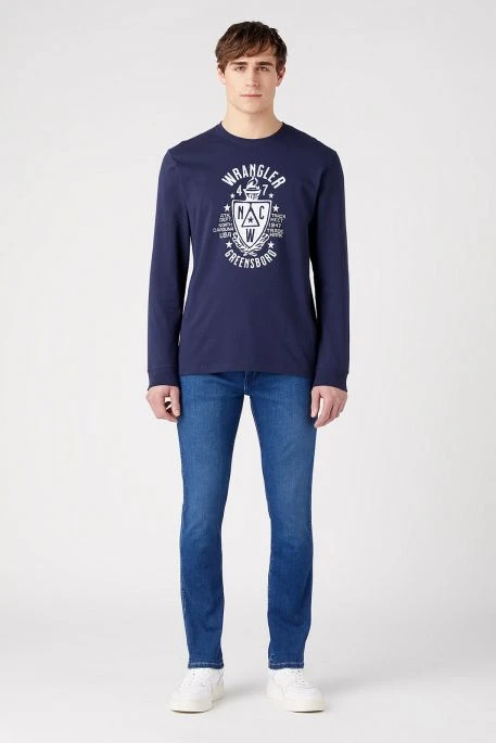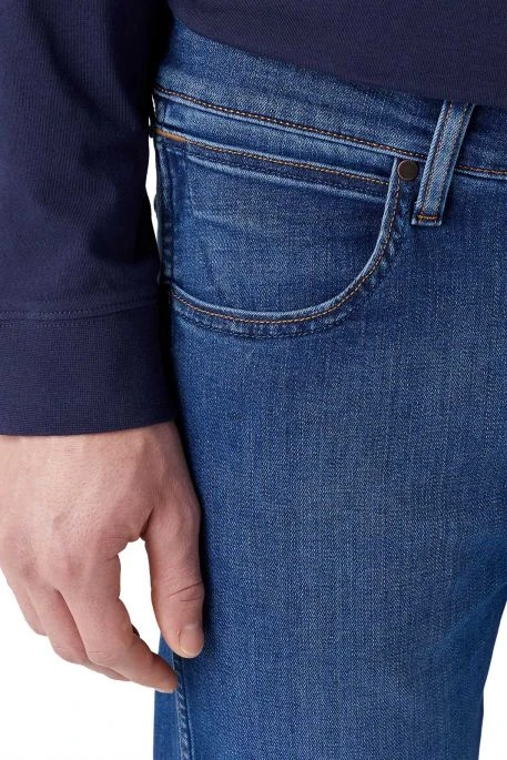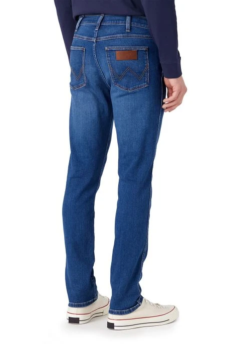 Jean Larston pour homme, Jeans Wrangler Larston pour homme. Jeans de coupe slim, bassin ajusté, resserré jusqu’à la cheville (mais pas skinny). Braguette zippée, 5 poches. Patch en cuir authentique arborant le logo de la marque.