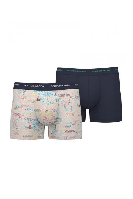 Lot de 2 Boxers Scotch & Soda Iconic pour homme. Boxers avec ceinture élastiquée avec inscription de la marque, matière avec élasthanne pour plus de confort, coupe classique. Ce lot contient un boxer bleu marine et un blanc avec motifs all over.