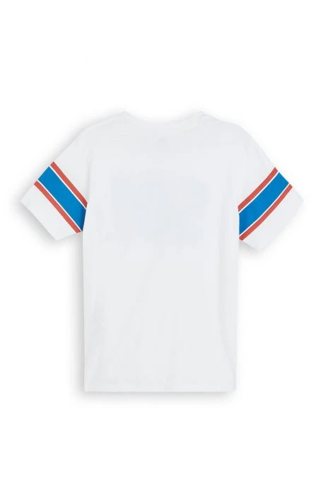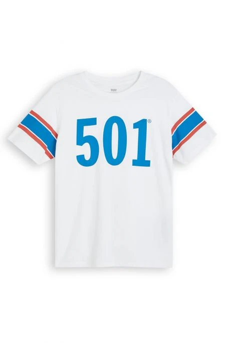 Tee Shirt Levi’s® pour homme, t-shirt de couleur blanc avec rayures bleu sur les manches, T-S avec encolure ronde, manches courtes, inscription 501® : la célèbre coupe de Levi’s® sur le devant.