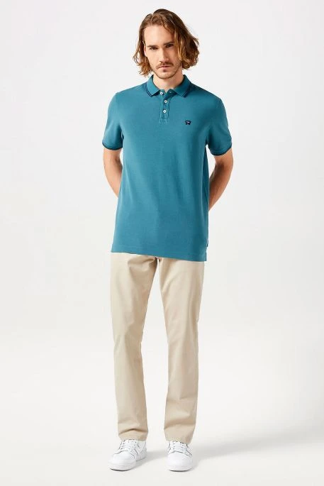 Pantalon Wrangler Greensboro pour homme. pantalon en toile de coupe droite, taille classique, braguette zippée, 5 poches. Ce modèle est idéal pour les personnes recherchant un pantalon confortable. Patch Wrangler brodé et couture « W » sur les poches arrières.