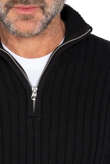 Pull Schott Ecorage2 pour homme. Pull camionneur recyclé en maille côtelée, coupe confort, col montant avec fermeture zippée. Finitions en bord-côtes pour le col, la taille et les poignets. Patch logo Schott® NYC sur l’épaule gauche.