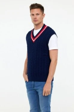 Pull Lee Cooper Cilka pour homme. Pull sans manche, coupe droite classique, col V en rib et rayure contrastée. Pull en maille torsadée.