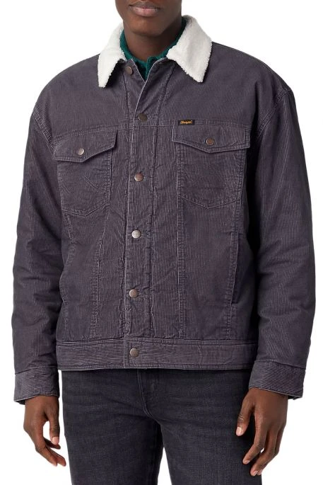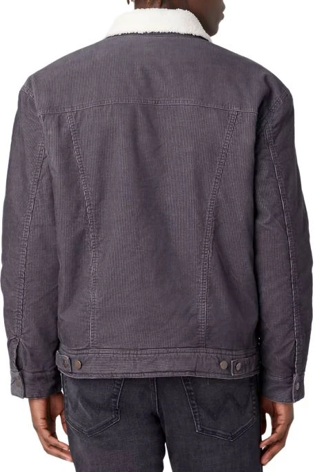 Blouson Sherpa en coton Wrangler fourré pour homme. Veste en velours cotelé noir délavé de coupe droite classique, doublure en sherpa au niveau du col du vêtement, fermeture par boutons pressionnés. Ce modèle possède 2 poches poitrine à rabat boutonné et 2 poches latérales passepoilées, étiquette Wrangler sur la poche,