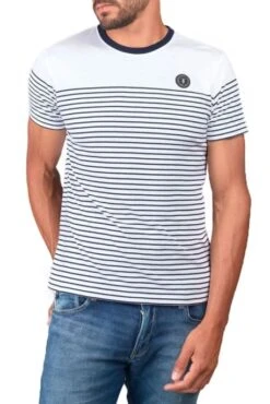 Tee Shirt Le Temps des Cerises pour homme, T-S manches courtes avec encolure ronde, tee shirt marinière avec écusson TDC sur la poitrine