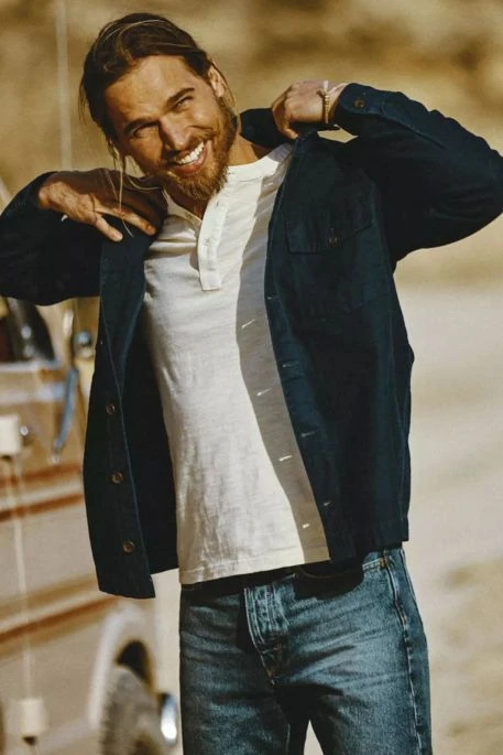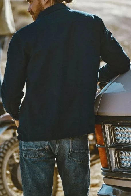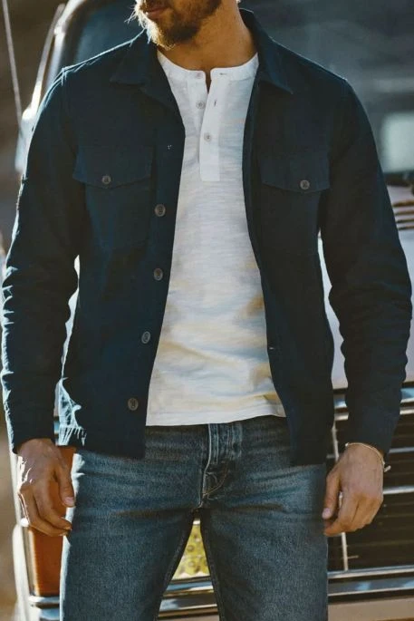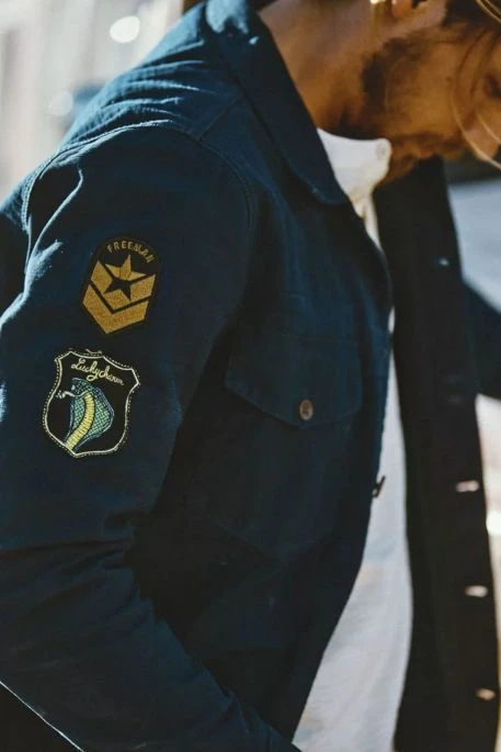Veste Freeman T.Porter Camilo Military pour homme. Veste légère de coupe droite, fermeture par patte de boutonnage, manches longues. Ce modèle possède 2 poches poitrine plaquées à rabat boutonné, des bandes contrastantes à chevron au-dessus des poches poitrine et deux écussons brodés sur l’épaule droite.